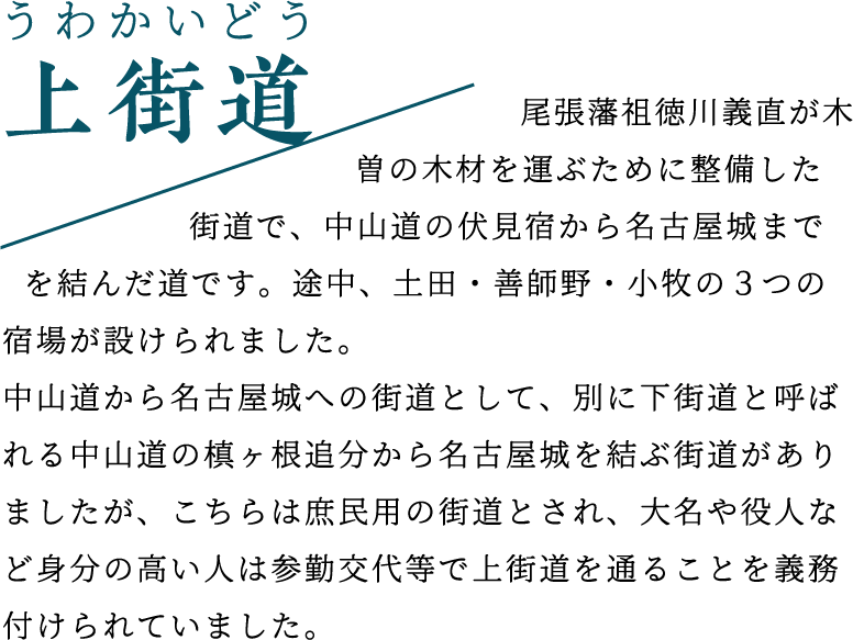 また、宿の南にある小牧御殿の一角には1782年に小牧代官所が設けられました。この小牧代官所では年貢の徴収や、宿場町の治安維持、裁判事などを行っており、その管轄範囲は現在の小牧市・犬山市・岩倉市・一宮市・江南市・大口町・扶桑町と広範囲に渡りました。